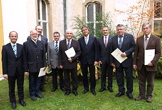 Zur Auszeichnung von Erhard Sommer und Karl-Heinz Ernstberger (von rechts), Herbert Bauer (Zweiter von links) und Josef Daubenmerkl (Fünfter von links) gratulierten stellvertretender Landrat Alfred Scheidler, Falkenbergs zweiter Bürgermeister Bernhard Schuller, Waldershofs zweiter Bürgermeister Karl Busch, Regierungspräsident Axel Bartelt und Mitterteichs Bürgermeister Roland Grillmeier (von links). |
