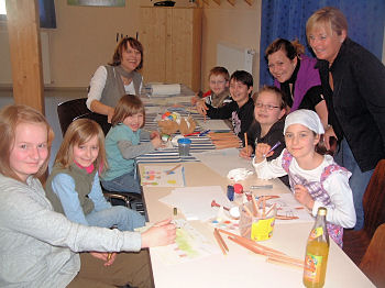| Viel los war jetzt beim "Osterkaffee"-Nachmittag der Frauenunion im SV-Sportheim. Während sich die Erwachsenen mit Kaffee und Kuchen versorgten, beteiligten sich rund 20 Kinder an einem Malwettbewerb. Am Ende waren viele Bilder mit Osterhasen und Ostereiern zu bestaunen. Die Betreuung übernahm das Team der Frauenunion um Vorsitzende Marion Schaumberger (rechts). Text u. Bild: Josef Rosner |