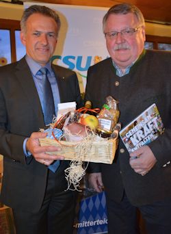 Mit einem Landkreiskorb voller heimischer Genüsse dankte CSU-Ortsvorsitzender und Bürgermeister Roland Grillmeier (links) seinem Vorgänger Karl-Heinz Ernstberger für dessen 33-jährige Tätigkeit im Vorstand der CSU Mitterteich. Sechs Jahre lang davon stand Ernstberger selber an der Spitze der Partei. |