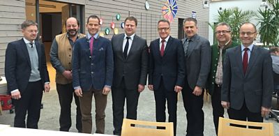 Jahresabschlussbesuch der CSU-Mandatsträger in den Stiftlandwerkstätten: Im Bild (von links) Kreisvorsitzender MdL Tobias Reiß, Einrichtungsleiter Josef Fick, MdB Albert Rupprecht, 2. Bürgermeister Stefan Grillmeier, MdB Reiner Meier, Bürgermeister Roland Grillmeier, Bezirksrat Toni Dutz und stellvertretender Landrat Dr. Alfred Scheidler.
