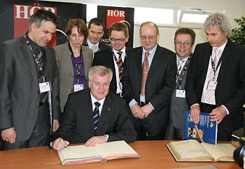 Bei der Besichtigung von HÖR wurde Seehofer auch von Bürgermeister Roland Grillmeier und Landrat Wolfgang Lippert begrüßt und trug sich in das Goldene Buch des Landkreises und der Stadt ein. Beide zeigten sich erfreut über den Besuch im Landkreis bei dem Seehofer die Stärken der Region kennen lerne. Man könne vieles vorweisen und baue auf eigenen Stärken. Aber gerade beim Strukturwandel und der demografischen Entwicklung, die sich als immer drastischer für die Region herausstelle, brauche man die Hilfe aus München. Die Verlagerung des Amtes für ländliche Entwicklung sei hier ein gutes Signal, aber nur ein "Tropfen auf den heißen Stein". Bürgermeister Grillmeier überreichte dazu ein Papier, in dem er dem Ministerpräsidenten auf die neuesten Zahlen zur Bevölkerungsentwicklungen hinweist.